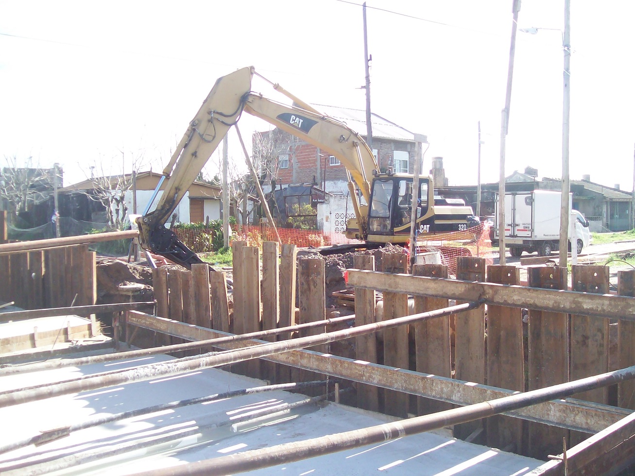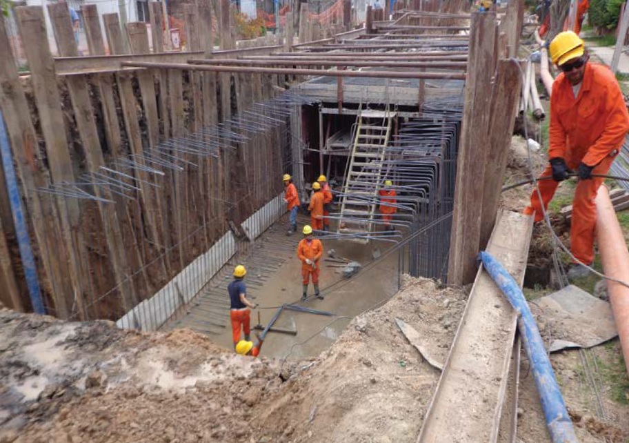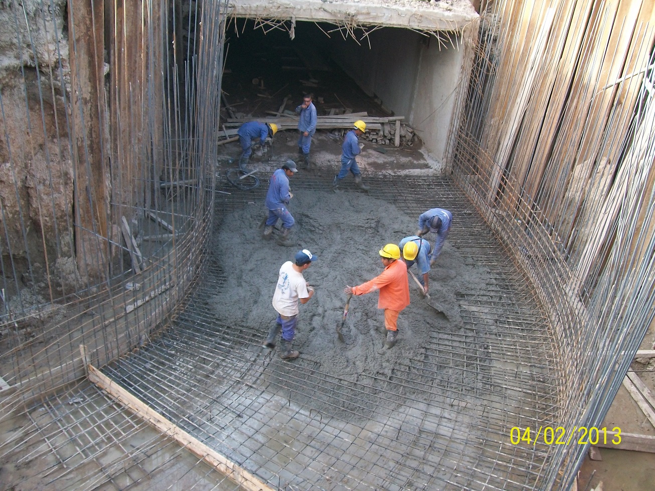 Debido a la profundidad de la excavación, aproximadamente 6 metros y la mala calidad del suelo, se debió deprimir las napas y colocar un tablestacado metálico a lo largo de toda la obra. La colocación del hormigón se realizó totalmente mediante bombeo dada la imposibilidad de acceso a los encofrados.