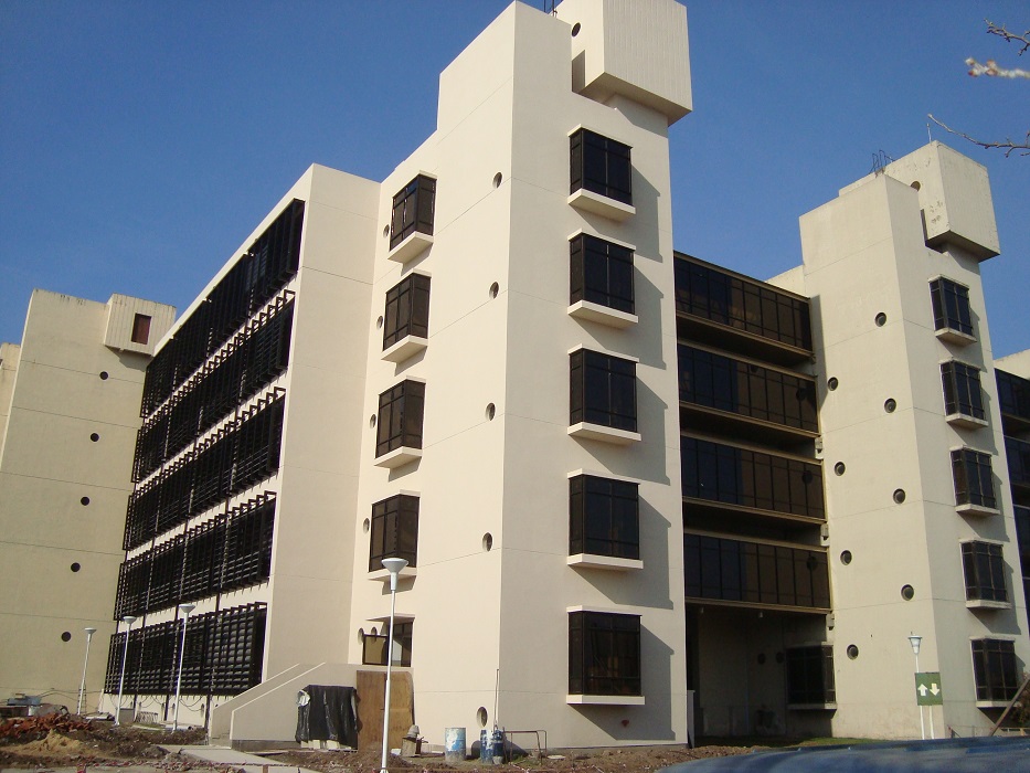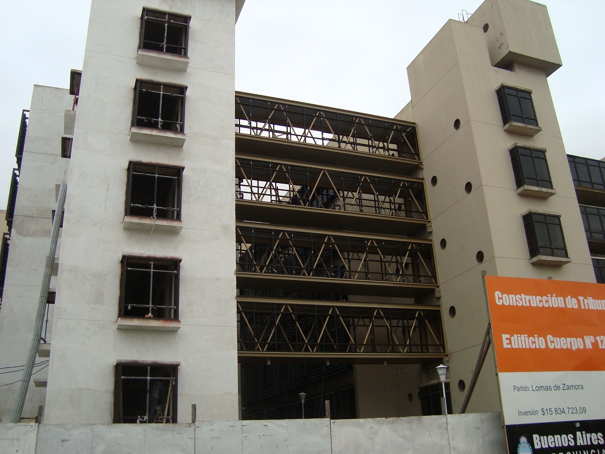 Los núcleos verticales de circulación y servicio aparecen como volúmenes de apoyo en Hº Aº y albañilerías, mientras que las circulaciones que funcionan como puentes privados están resueltos con estructuras metálicas, completamente vidriados y el subsuelo ejecutado en Hº Aº y albañilería.