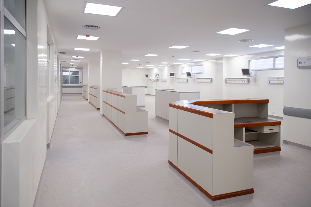 En el primer piso se encuentra la zona de terapia intensiva y habitaciones para pacientes aislados con los locales de apoyos necesarios como ser enfermería, office de alimentación, entre otros.